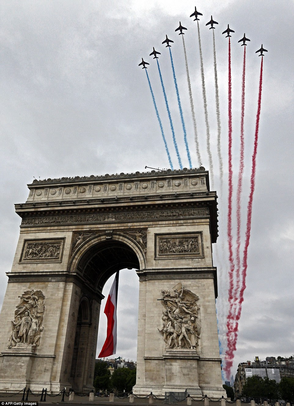 Nine jets form the French Air Force scream over the Arc de Triomphe as part of the celebrations for Bastille Day releasing smoke in the colours of the French flag